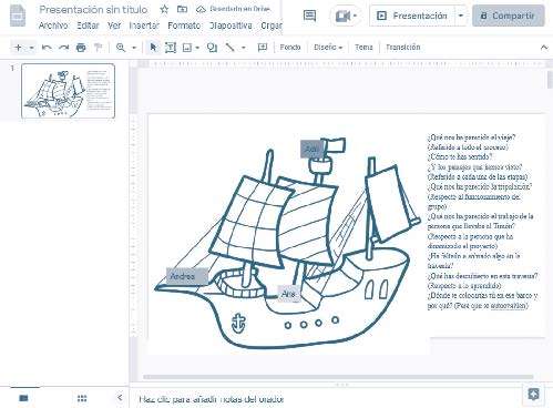 A continuación, le propondremos al grupo que se coloque en el lugar que han anotado, por ejemplo, situando un cuadro de texto con su nombre en algún punto del barco.