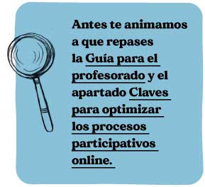 Recordemos que vamos a desarrollar un proceso participativo en el que el alumnado sea capaz de organizarse y desarrollar una acción de sensibilización. No olvides que también es importante facilitar las herramientas que les permitan integrar criterios de sostenibilidad ecológica, igualdad de oportunidades y posibilidades y justicia global.